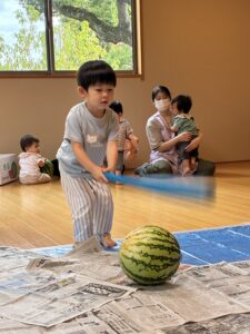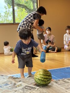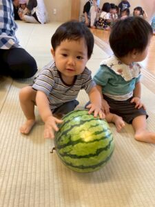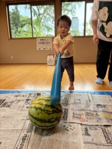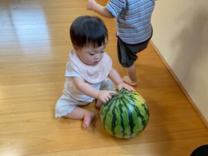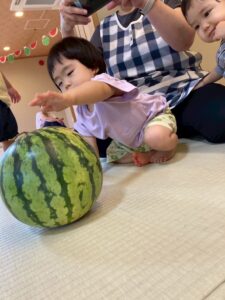 小さなお友達も大きなスイカを触って転がして遊んでました。