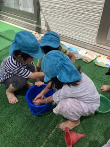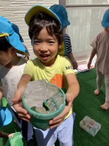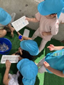 みんなでトレーから氷を出して触ったり冷たさを感じたり溶かしてみたりと楽しそうに遊んでいました。