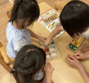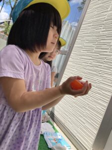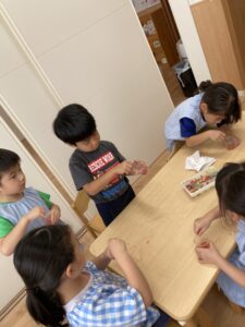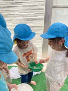 「水を入れると早く溶けるね」と色々なことに気づいて友だちと話し合っていました。