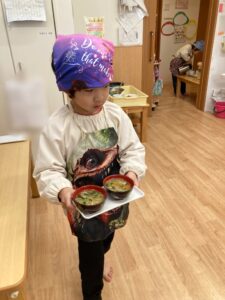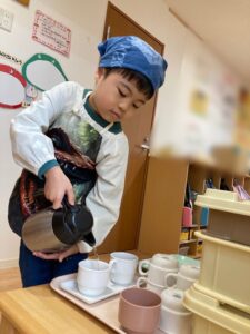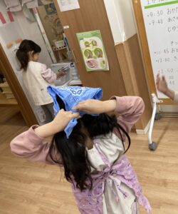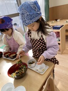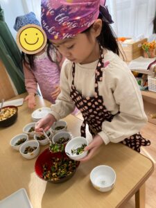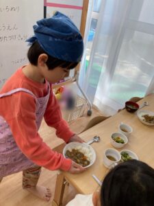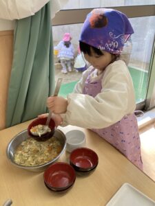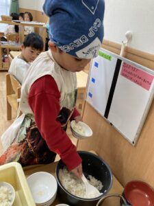 他にもお米を洗って炊いたり、朝の体操で前に出て下のクラスのお友だちのお手本になったりと頑張っています✨
