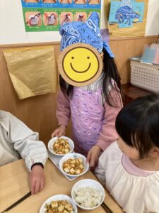 配膳が終わったらメニューの紹介、おかわりの終了時間と食べ終わりの時間をお当番さんが伝えて、みんなで「いただきます!!!」