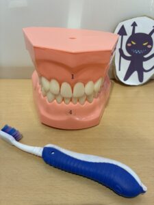 歯磨きの模型を使って、アーの口、イーの口をしながら一本一本意識しながら磨く事を説明しました。