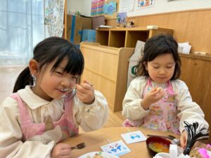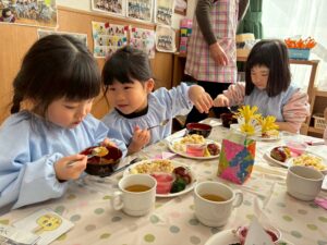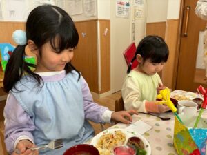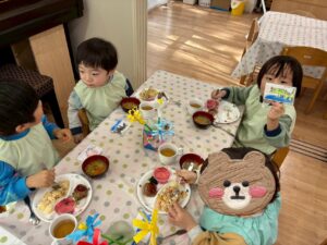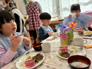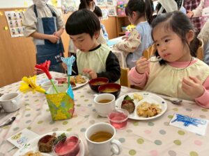 ひまわり組さんのおもてなしで、料理が配られるとみんな楽しんでご飯を食べていました。