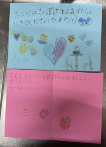 ひまわり組さんが、お店の名前やメニュー、お財布やおかね、招待状を準備しました。