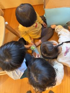 1つの紙粘土を自由に触って、丸めたりちぎったりして遊びました。