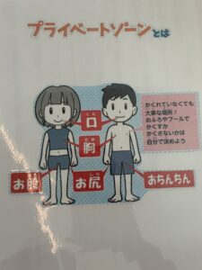 プライベートゾーンの事を知ることは、自分を守る為と他の人を思いやる事に繋がります。幼児期から知っておくのは早い事ではありません。お家では、自分の大切な場所は自分で洗おうねと、教えて頂けたらと思います。