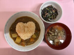 〇カレーライス(みんなのこと大好きだよの意味をこめてハートのごはんにしました)