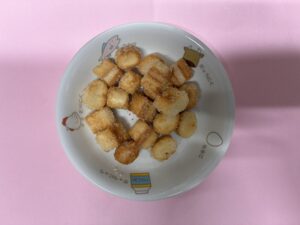 ロールパンを油で揚げて、きな粉をまぶしています。